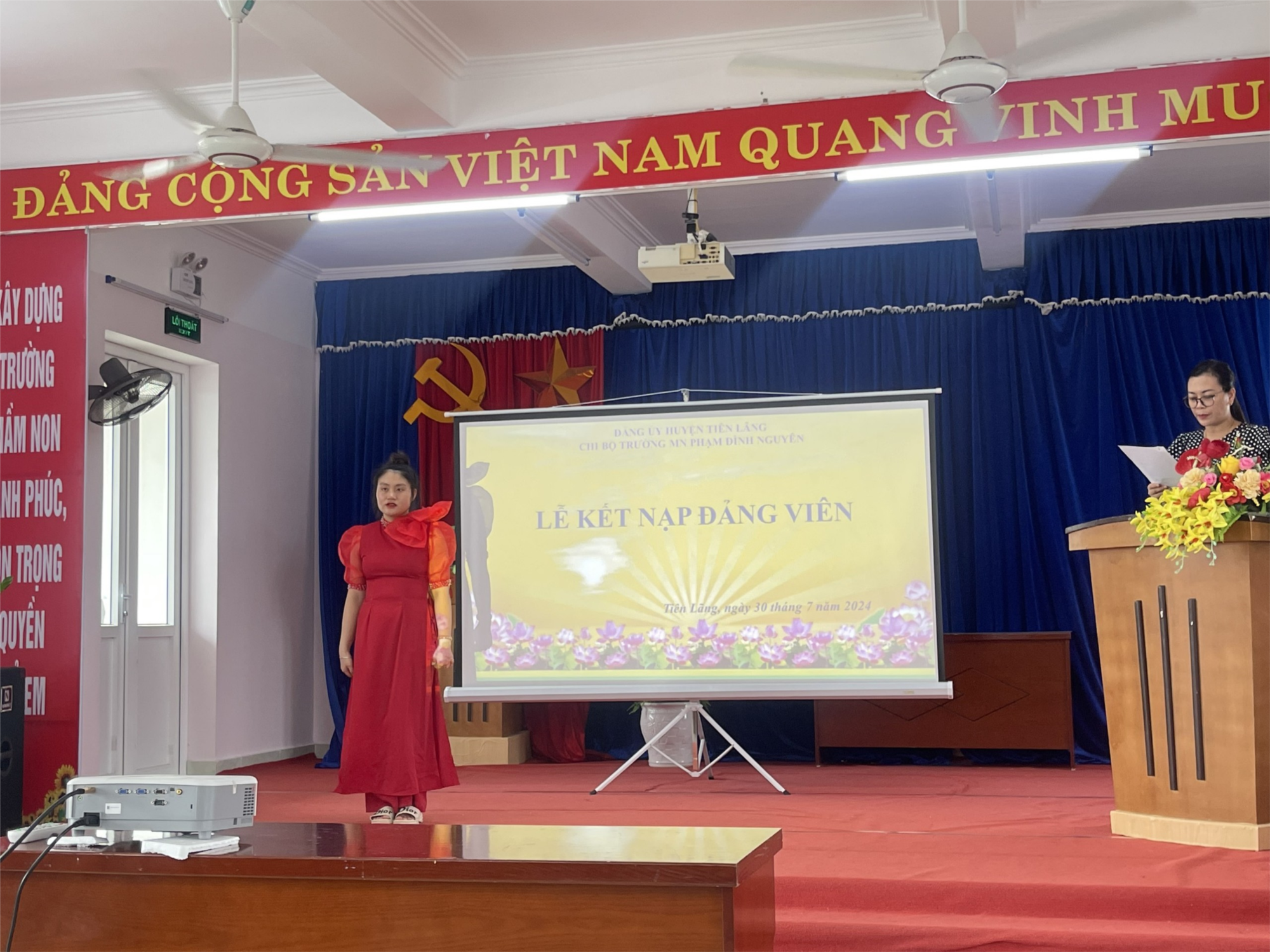 Sáng ngày 30 tháng 07năm 2024 Chi Bộ trường mầm non Phạm Đình Nguyên long trọng tổ chức " Lễ kết nạp Đảng viên" cho đồng chí Nguyễn Thị Ngân. Về dự lễ kết nạp có đồng chí Dương Thị Huyền Bí Thư Chi Bộ Hiệu trưởng nhà trường, các đồng chí trong cấp ủy Chi bộ và 100% các đồng chí Đảng viên có mặt đông đủ. Buổi lễ đã diễn ra thành công tốt đẹp.