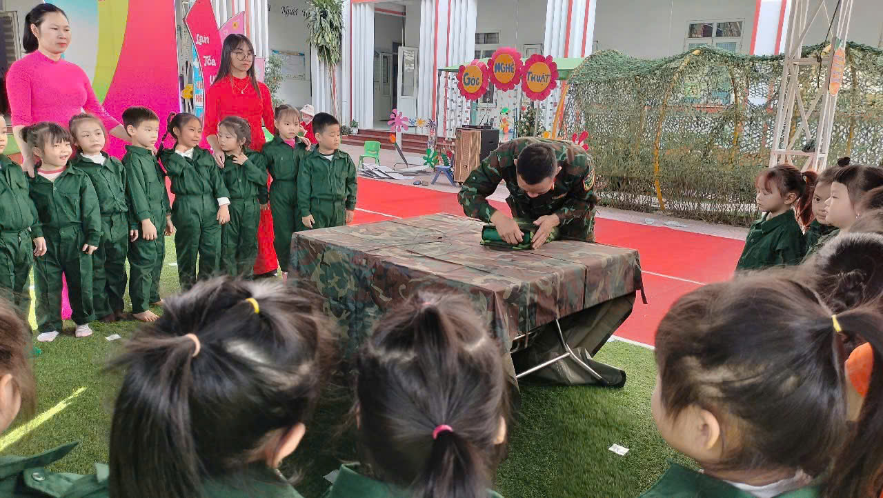 🍀 Trong khuôn khổ 02 ngày diễn ra chương trình từ ngày 18 đến ngày 19/12/2014. Được sự nhất trí của các đồng chí lãnh đạo, nhà trường đã xây dựng và tổ chức cho trẻ tham gia chuỗi các hoạt động chào mừng: Dâng hương tại tượng đài Anh hùng Lực lượng Vũ trang Nhân dân Phạm Ngọc Đa, thăm và chúc mừng Ban Chỉ huy Quân sự huyện Tiên Lãng, hoạt động trải nhiệm bữa cơm hành quân, chuẩn bị và thực hành gấp tư trang của chú bộ đội, cùng các cô bác tham gia dựng trại, tìm hiểu lịch sử dân tộc qua hình ảnh tư liệu và mô hình sa bàn, các hoạt động tái hiện lại không khí luyện tập chiến đấu, giải phóng hòa bình....