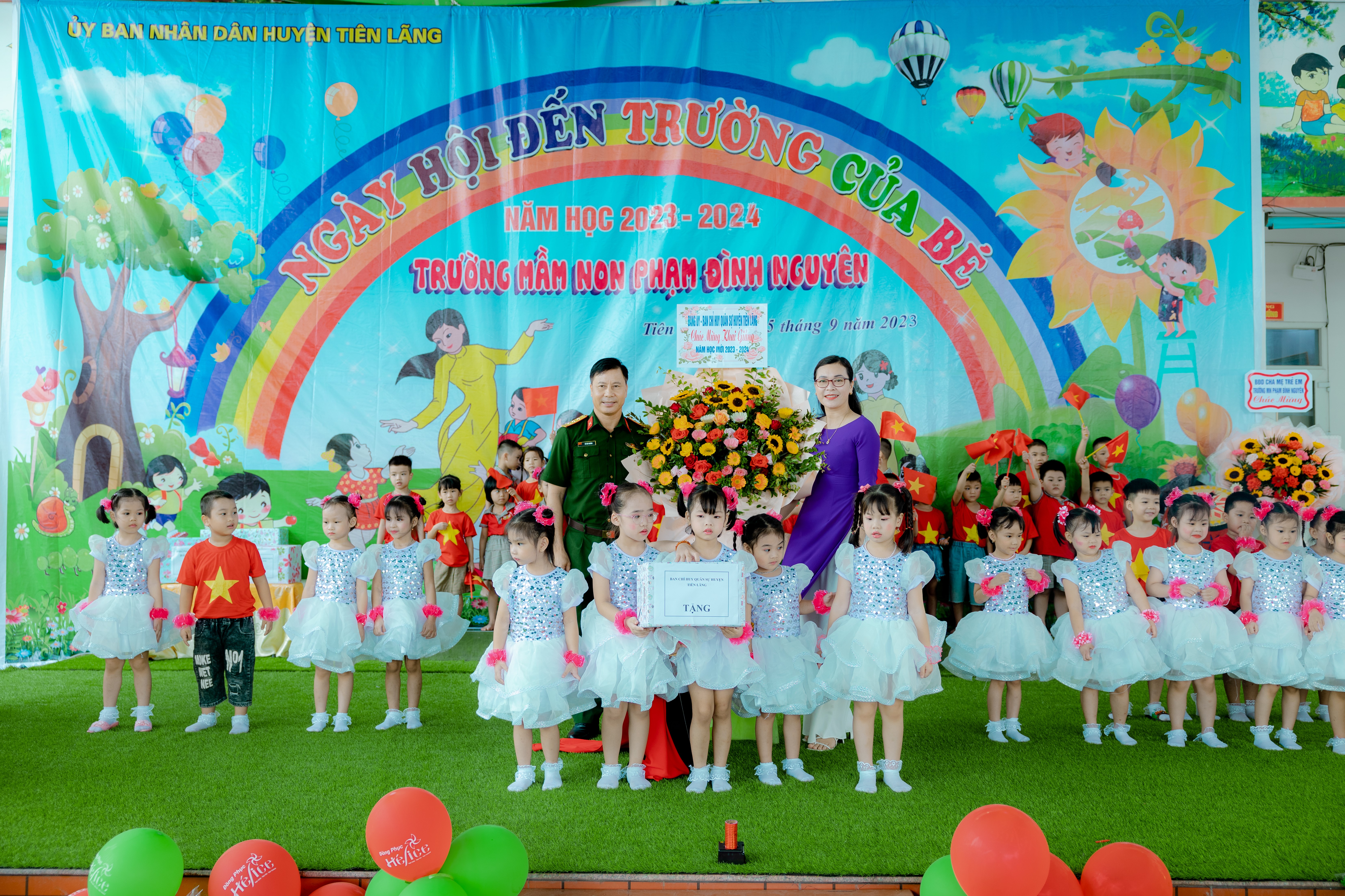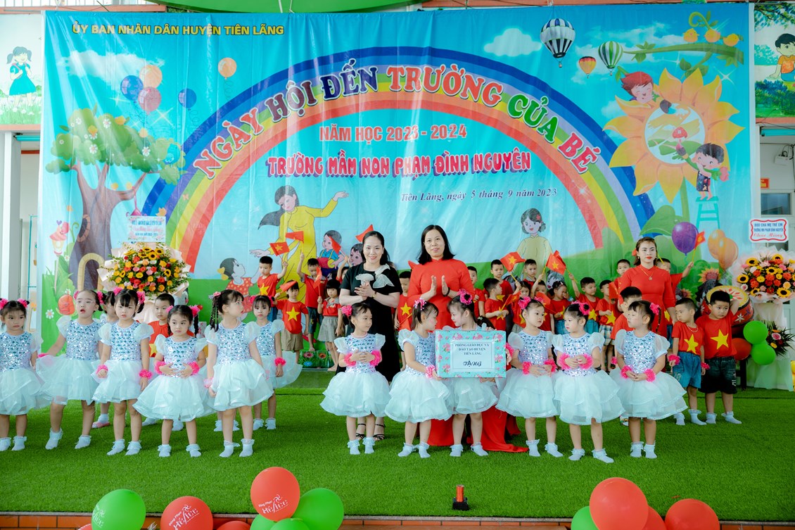 Hòa trong không khí ngày hội toàn dân đưa trẻ đến trường chào đón năm học mới. Hôm nay ngày 05 tháng 09 năm 2023 trường mầm non Phạm Đình Nguyên long trọng tổ chức "Ngày hội đến trường của bé" năm học 2023 - 2024. Về dự ngày hội nhà trường vinh dự được đón tiếp các vị đại biểu : Đồng chí Thượng tá Vũ Văn Thương - Chính trị viên - Phó ban chỉ huy quân sự Huyện Tiên Lãng, Cô Đỗ Thị Mai - Chuyên viên PGD và đào tạo Huyện Tiên Lãng, Bác Phạm Hoàng Trà My - Chủ tịch Ban đại diện cha mẹ trẻ em nhà trường, các ông bà là chi hội phụ huynh các lớp, các cô trong Ban giám hiệu nhà trường, cùng toàn thể CBGVNV và 379 trẻ trong toàn trường đã có mặt đông đủ. Trong ngày hội nhà trường xin được trân trọng cảm ơn những tình cảm và sự quan tâm của các vị đại biểu, các bậc phụ huynh đã có quà và những lẵng hoa tươi thắm dành tặng cho nhà trường. Xin được trân trọng cảm ơn!