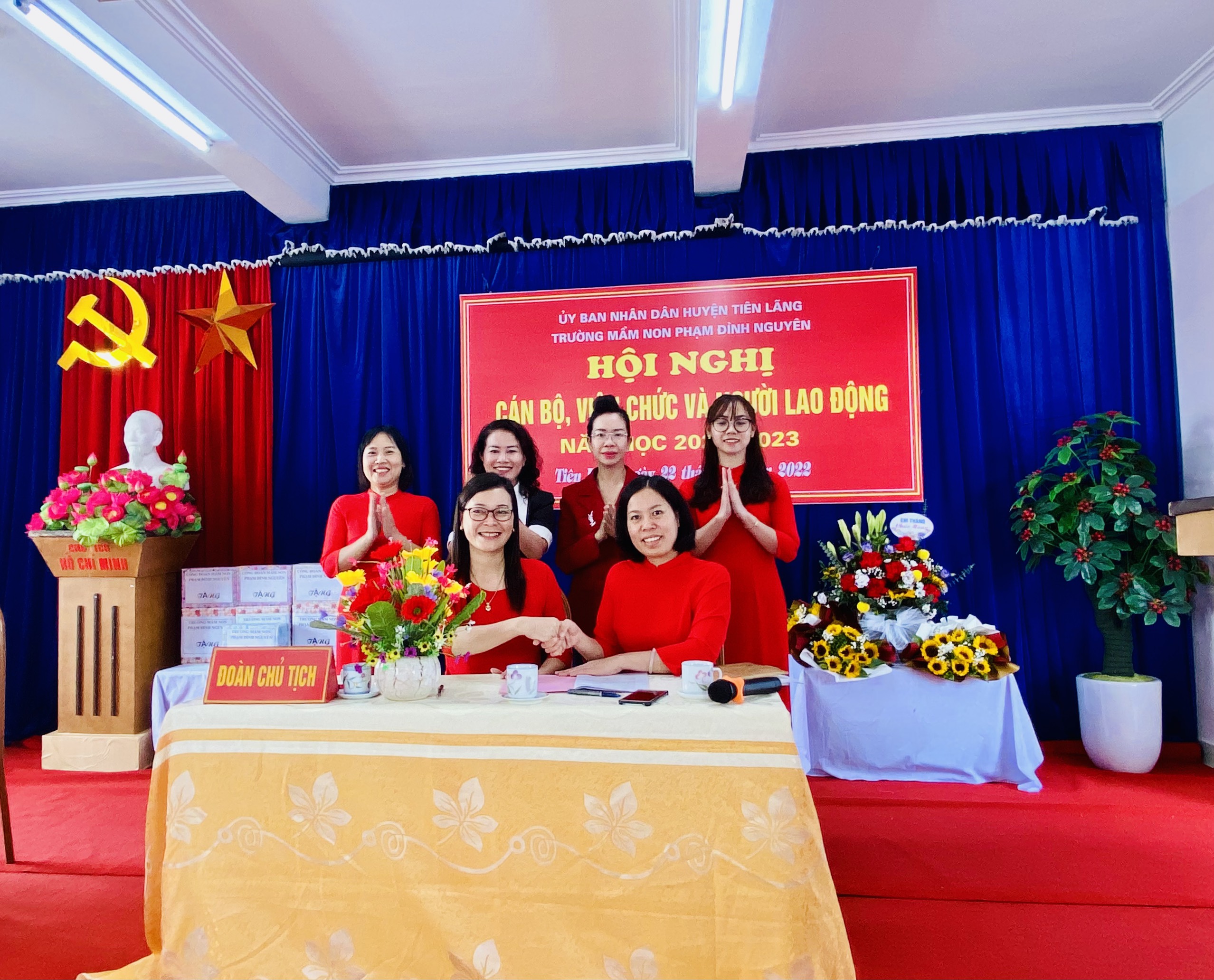 Sáng ngày 22 tháng 10 năm 2022 trường mầm non Phạm Đình Nguyên long trọng tổ chức Hội Nghị " Cán bộ viên chức, người lao động" năm học 2022 - 2023. Về dự hội nghị nhà trường vinh dự được đón Bà Nguyễn Thị Hương - Huyện Uỷ viên - Chủ tịch liên đoàn lao động huyện Tiên Lãng, Bà Phạm Hoàng Trà My - Chủ tịch hội cha mẹ trẻ em nhà trường cùng toàn thể cán bộ giáo viên nhân viên nhà trường có mặt đông đủ. Hội nghị vinh dự được đón nghe ý kiến phát biểu của các vị đại biểu và hứa sẽ làm tốt các nhiệm vụ cấp trên giao cho, luôn cố gắng lỗ lực hết mình để tập thể trường ngày càng lớn mạnh, giữ vững danh hiệu trường điểm của huyện.